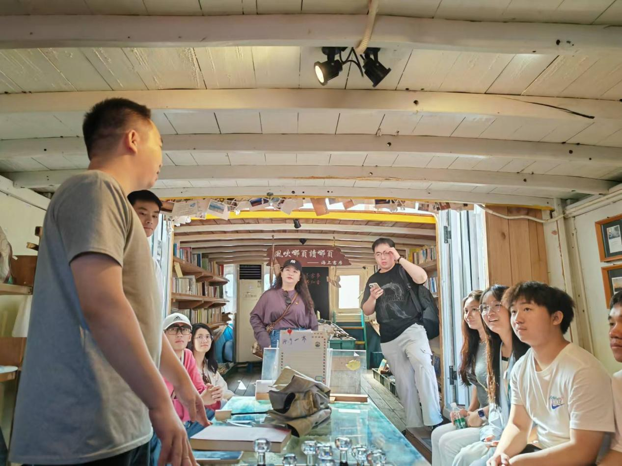 第二站,参观西岛海上书屋,学生党支部在海上书屋开展了一次特别的支部座谈会。在摇晃的书屋上,学生党员们分享个人经历,交谈入党感受,其中研究生党员吴晓飞和学生党员张晋源分享了参观海上书屋的感悟,谈及参观民兵女排的感悟,呼唤在座党员们学习民兵女排精神,激励党员们成长为有担当、敢作为的新时代党员,为践行党的使命添砖加瓦。