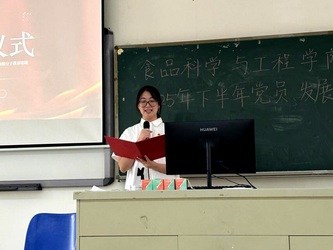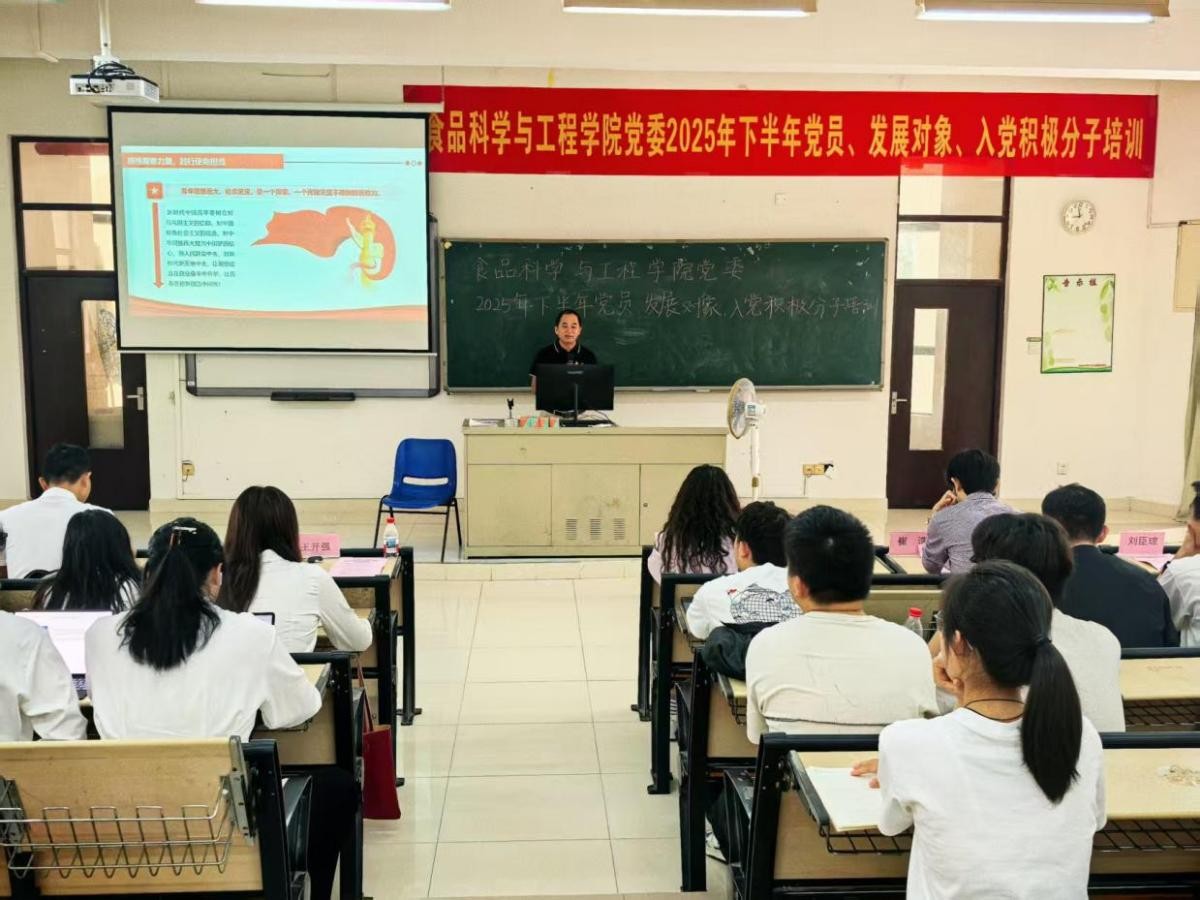 10月25-26日,食品科学与和工程学院党委成功举办“铸牢理想信念,坚定使命担当”主题党日活动暨2025年下半年党员、发展对象及入党积极分子专题培训活动。部分教师党员、学生党支部全体党员、发展对象、入党积极分子参与培训,党建联合会李诗韵主持活动。