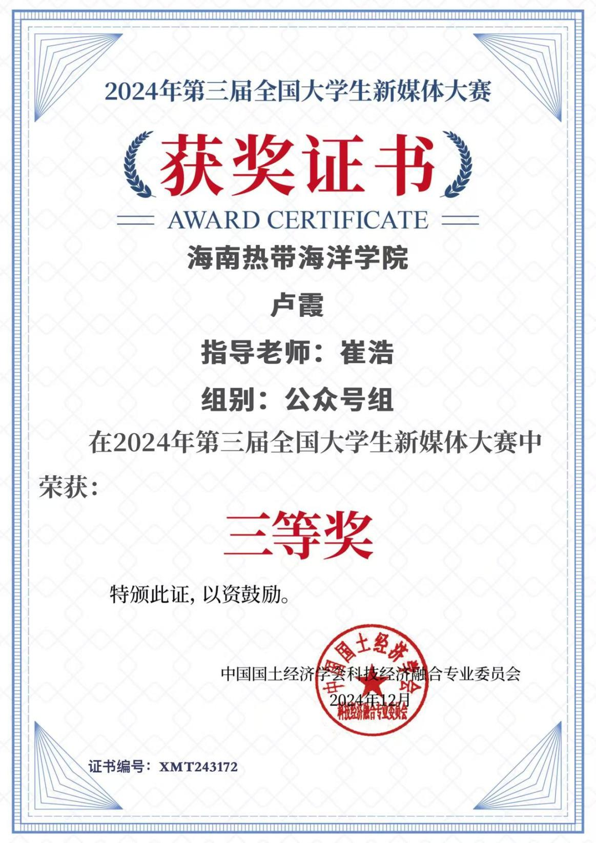 此次获奖不仅是对卢霞同学个人能力的肯定,也是yl6809永利集团团属新媒体育人成果重要体现。在我院党委的正确领导下,我院团委将继续秉承“三全育人”理念,鼓励和支持学生们积极参与各类学术竞赛和实践活动,不断提升自身的综合素质和创新能力,为我院学生培养工作尽一份力量。