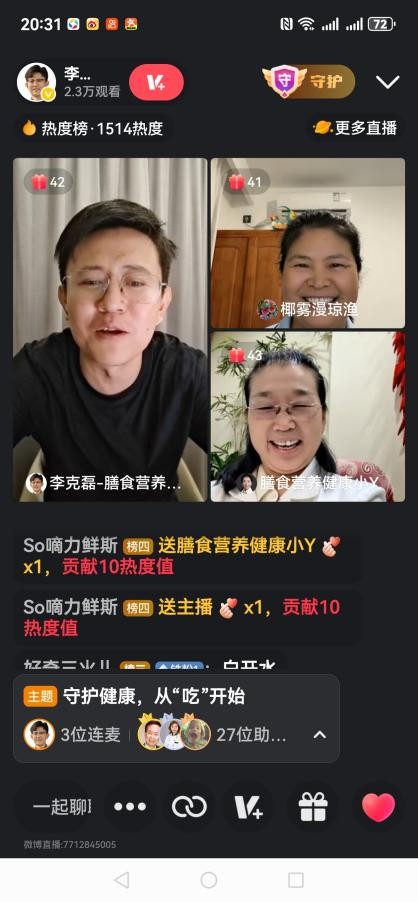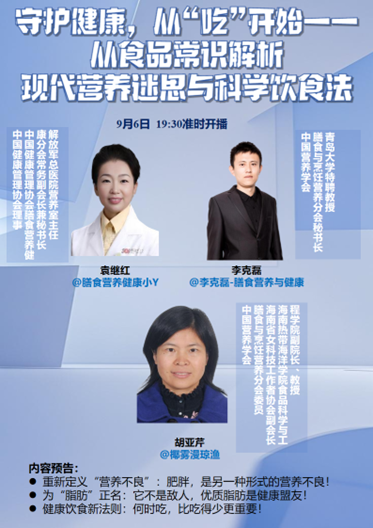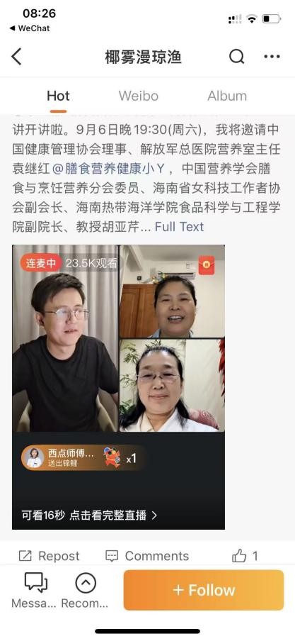 受中国营养学会膳食与烹饪营养分会秘书长李克磊教授的邀请,我院副院长胡亚芹教授于2025年9月6日晚19:30以连麦微博的方式参与直播,解放军总医院临床营养专家袁继红主任担任共同主持人,聚焦食品健康常识,进行了一场科普讲座,共同解析现代营养迷思,分享科学饮食方法,为观众带来一场实用的健康科普盛宴。直播间受众达2.35万人。