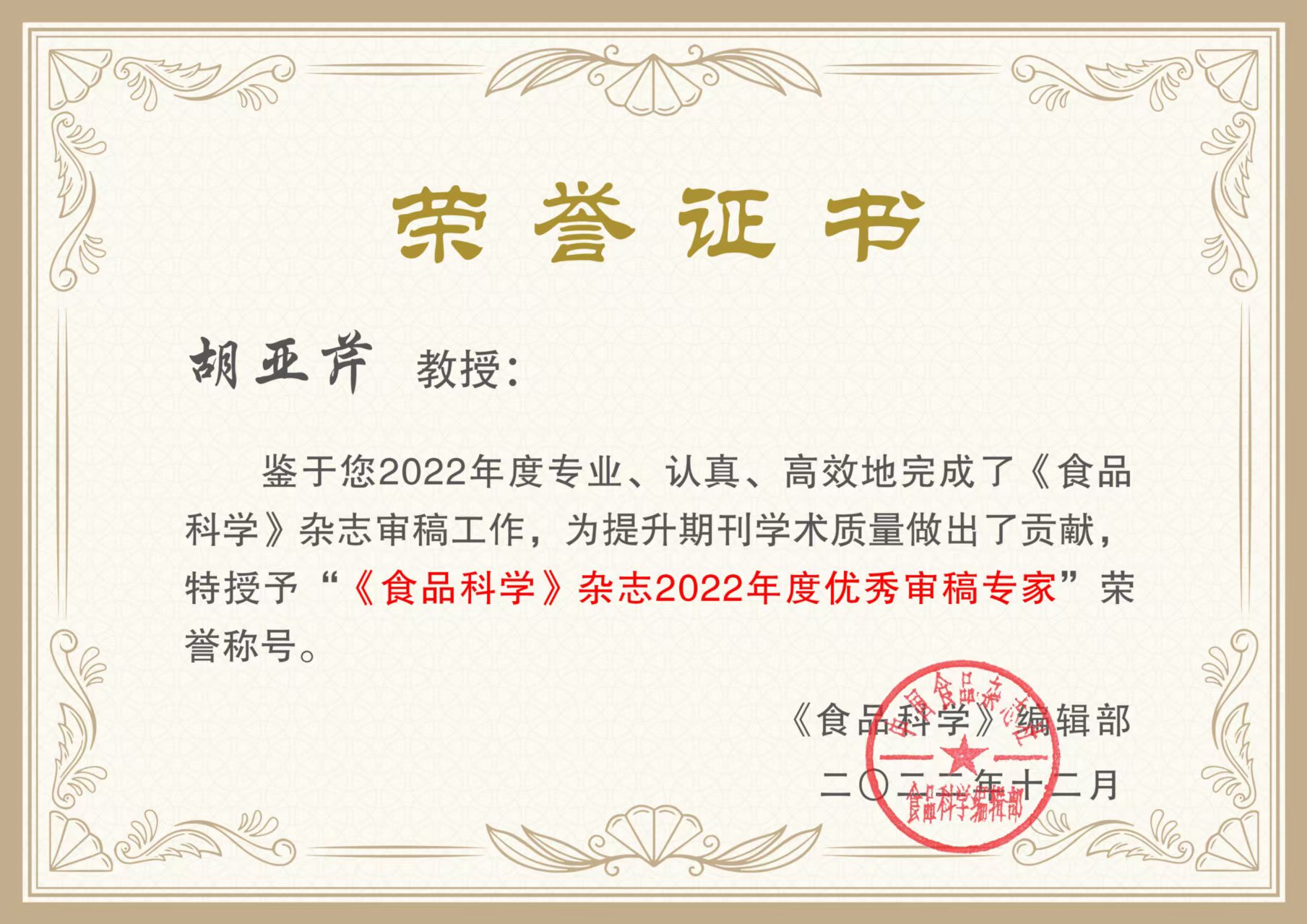 yl6809永利集团胡亚芹教授荣获《食品科学》杂志2025年度“优秀审稿专家”称号